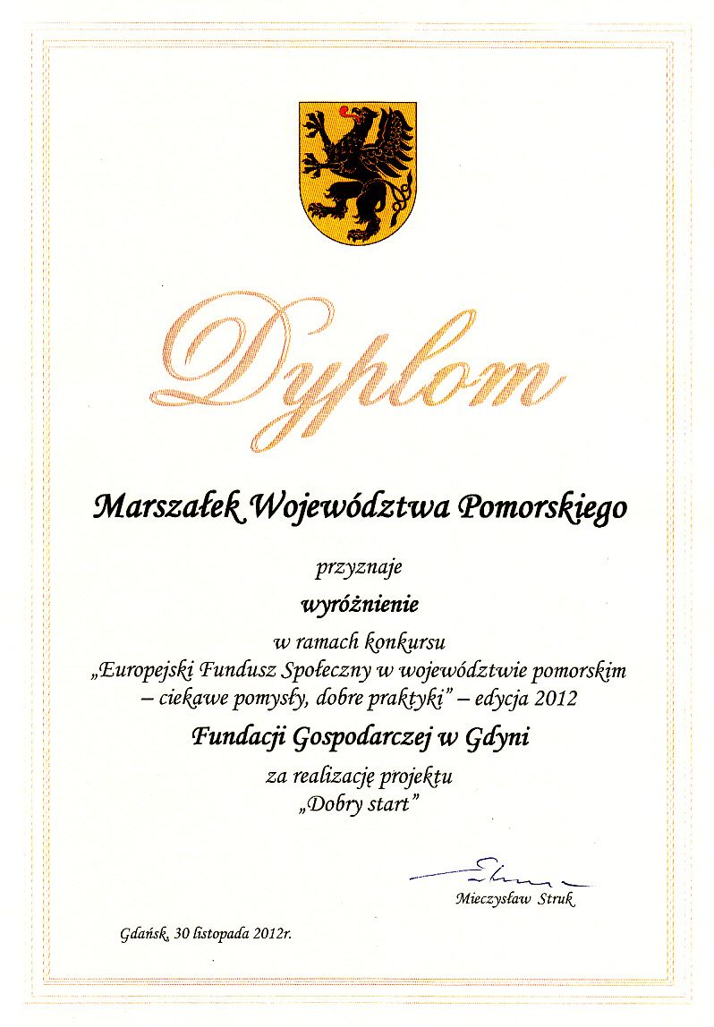Marszałek Województwa Pomorskiego przyznał wyróżnienie Fundacji Gospodarczej za realizację projektu Dobry start.